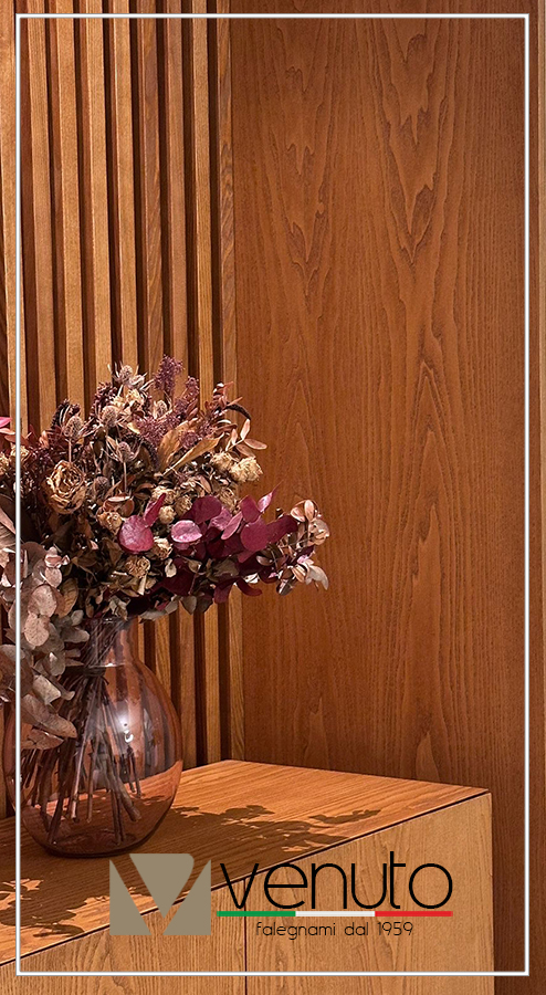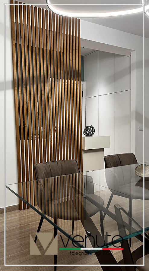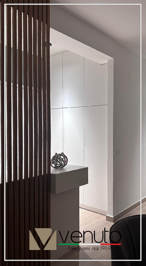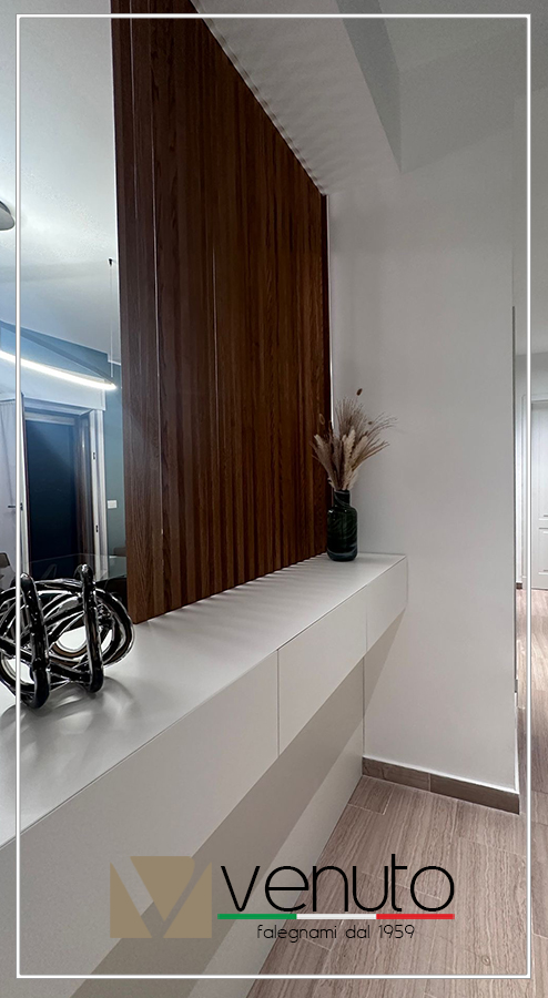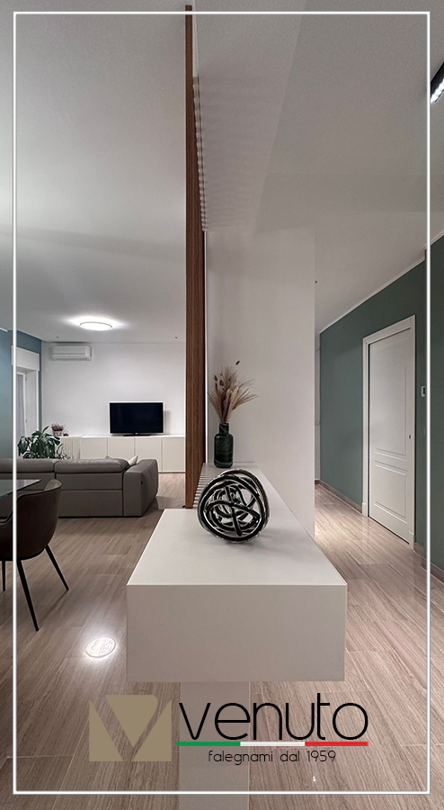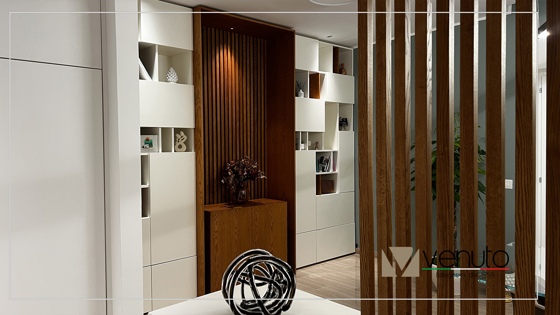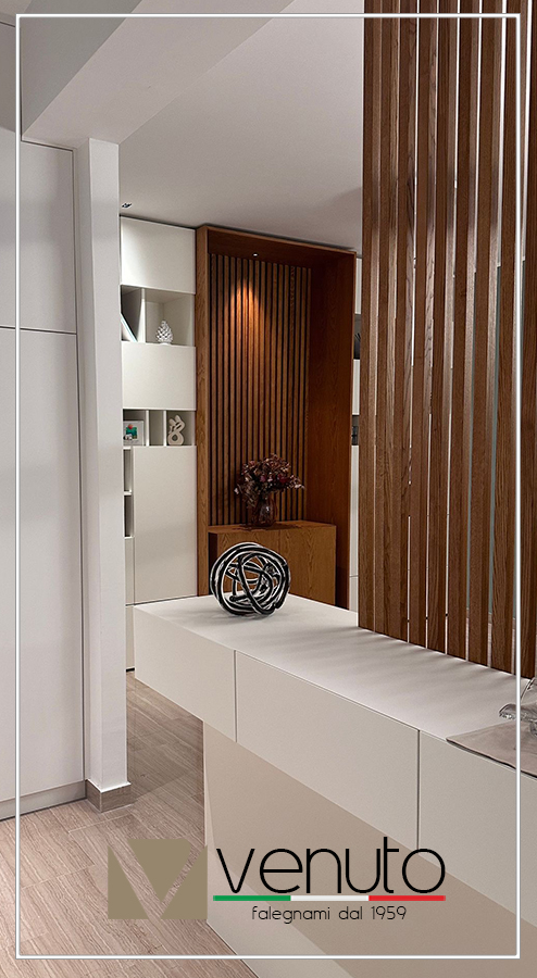 Proprio in considerazione della centralità di tale ambiente, L’obiettivo del progetto era di creare un ambiente intensamente armonioso, ospitale e accogliente, ma anche molto ricercato dal punto di vista estetico. Lo spazio risulta quindi essere elegante ma non algido, lineare ma sempre confortevole, magari addirittura strutturato in modo modulare così da presentarsi multifunzionale. L'accostamento del laccato con l'essenza di frassino mielato, conferisce al progetto una personalità e uno stile ricercato in ogni suo dettaglio. L'ingresso con l'effetto dogato in frassino massello e un mobile contenitore accoglie in maniera elegante nella parte centrale della casa. La grande libreria con moduli contenitivi e moduli aperti e la parte centrale dogata integra un mobile bar anch'esso in frassino movibile. La madia contenitiva nella zona relax è completata da un copritermosifone in legno integrato con il mobile.