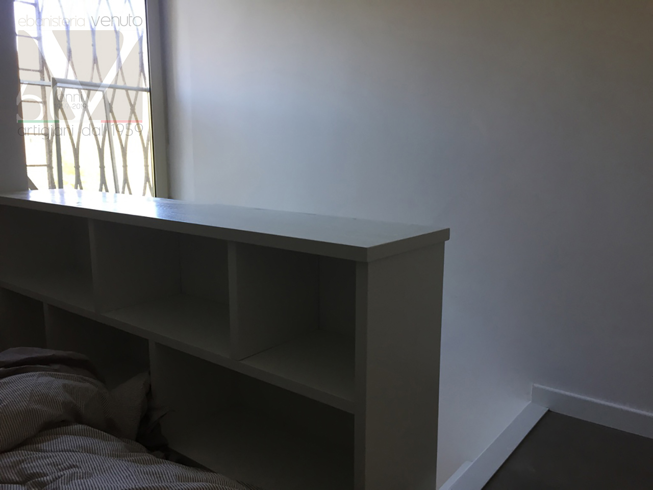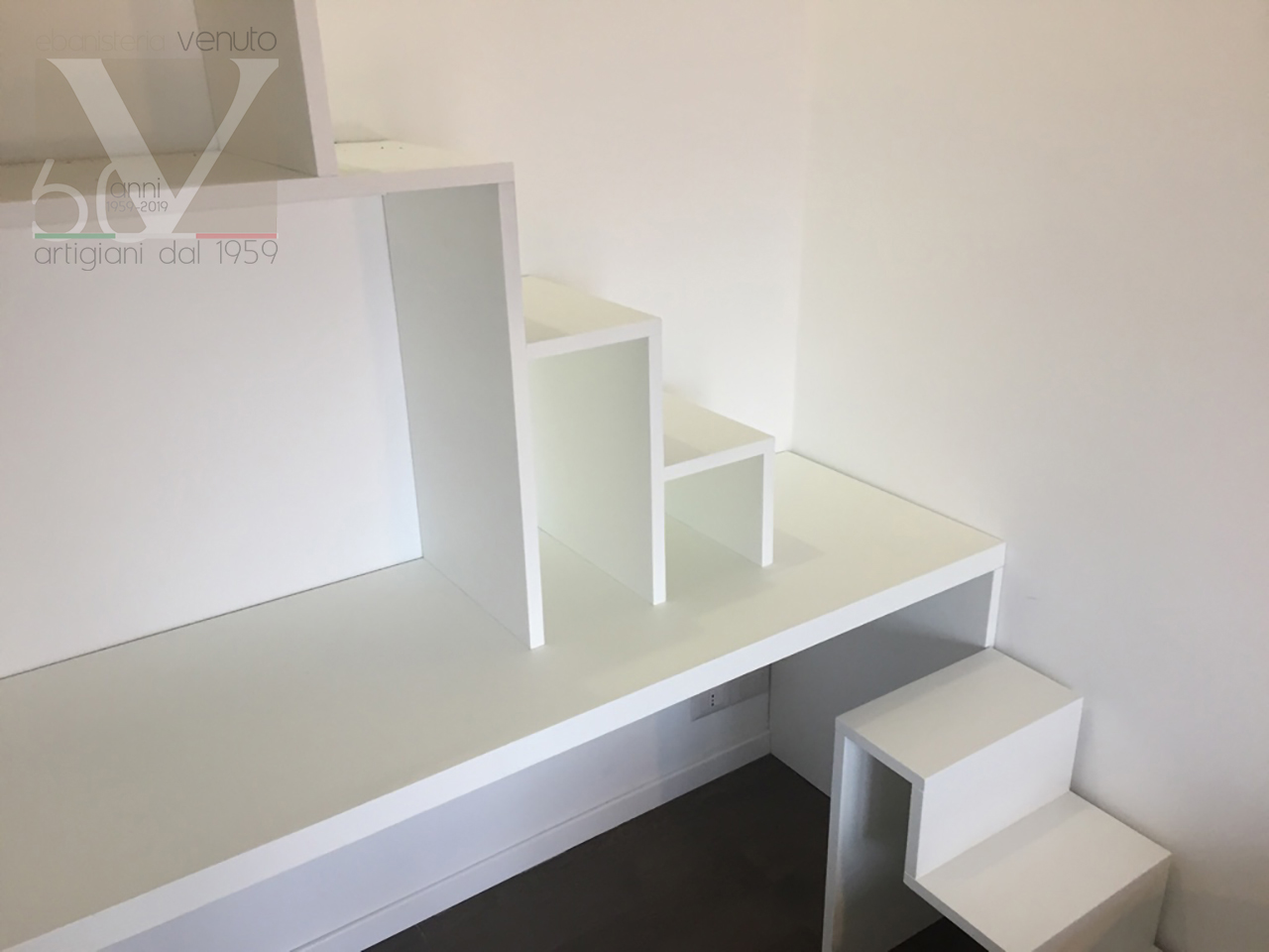 Arredo per camera ragazzi studiato su misura dai nostri architetti che sfruttando l'altezza di queste due camerette per ragazzi hanno realizzato un soppalco per dividere la zona giorno dalla zona notte. La scala è realizzata con degli spazi contenitivi e un piano adibito a scrivania, il tutto è realizzato in frassino bianco a poro aperto. Nella zona notte èstato realizzato un mobile contenitore su misura che funge anche da separazione tra scala e letto